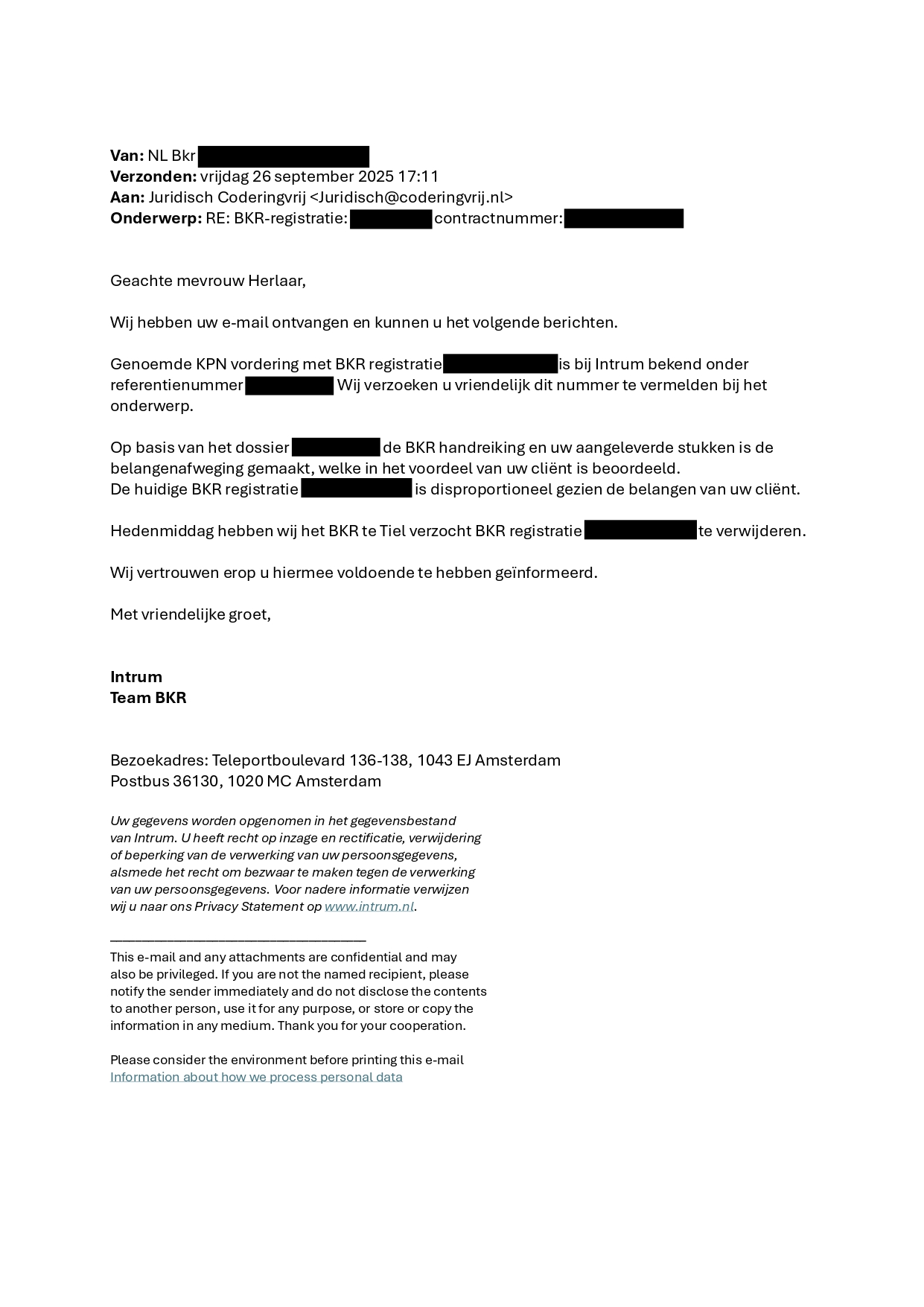 A-, 1-, en 2-coderingen tot gevolg had gehad op zijn registratie. Het dossier was door deze achterstand overgedragen aan Intrum Nederland B.V. en via een betalingsregeling is de gehele vordering destijds voldaan.