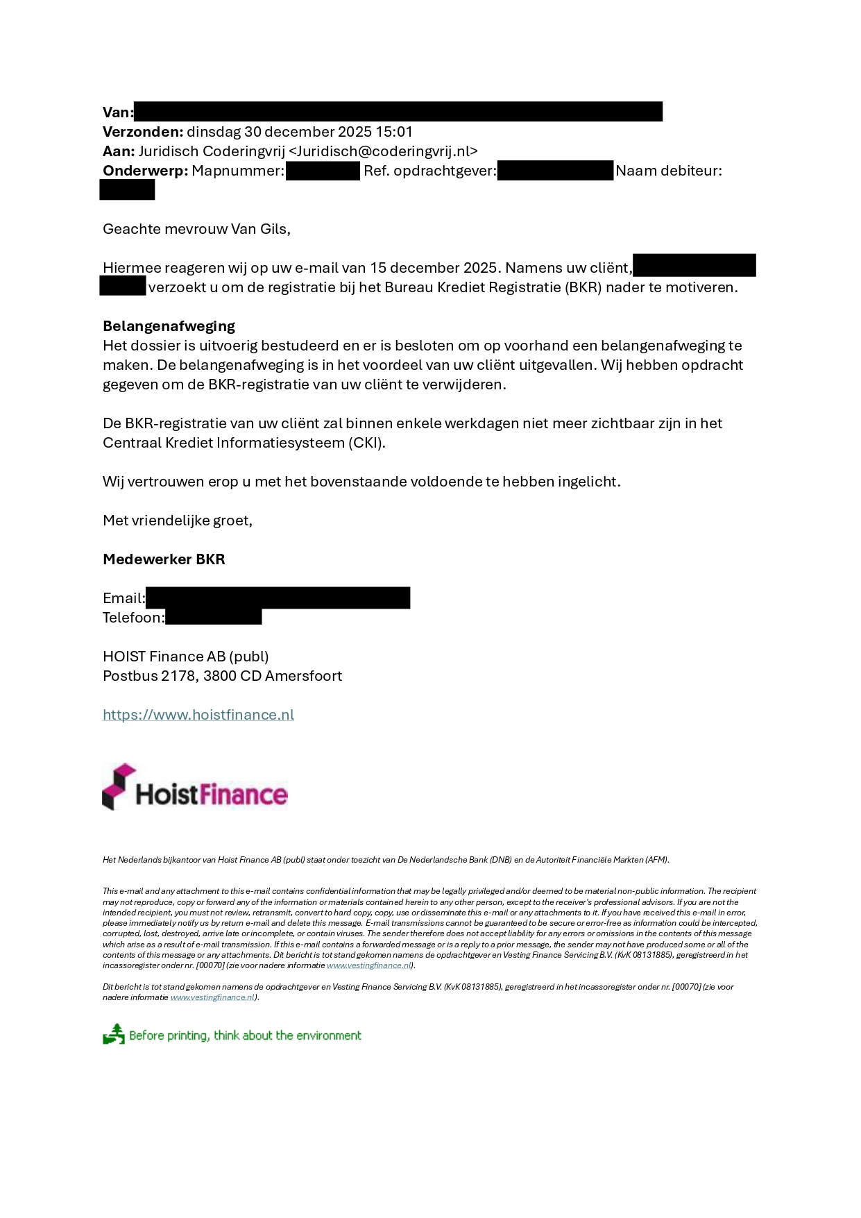 Het ging over een krediet bij Hoist Finance, wat al jarenlang liep en in 1990 was afsloten. In december 2008 was er een achterstand ontstaan, waardoor de registratie de