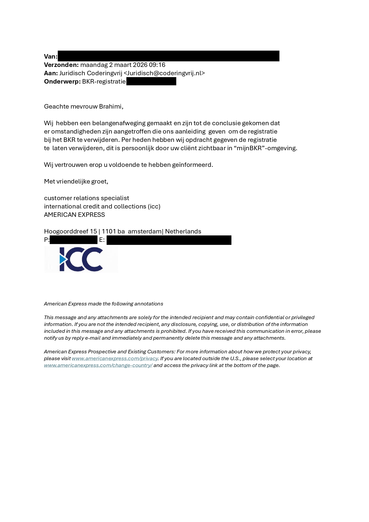 contact opnamen met CoderingVrij. Zij kregen namelijk geen hypotheek door één negatieve BKR-registratie. Het ging over een BKR-registratie van American Express met een achterstandsmelding en bijzonderheidscode 2. Deze registratie was afkomstig van een – in het verleden afgesloten – creditcard.