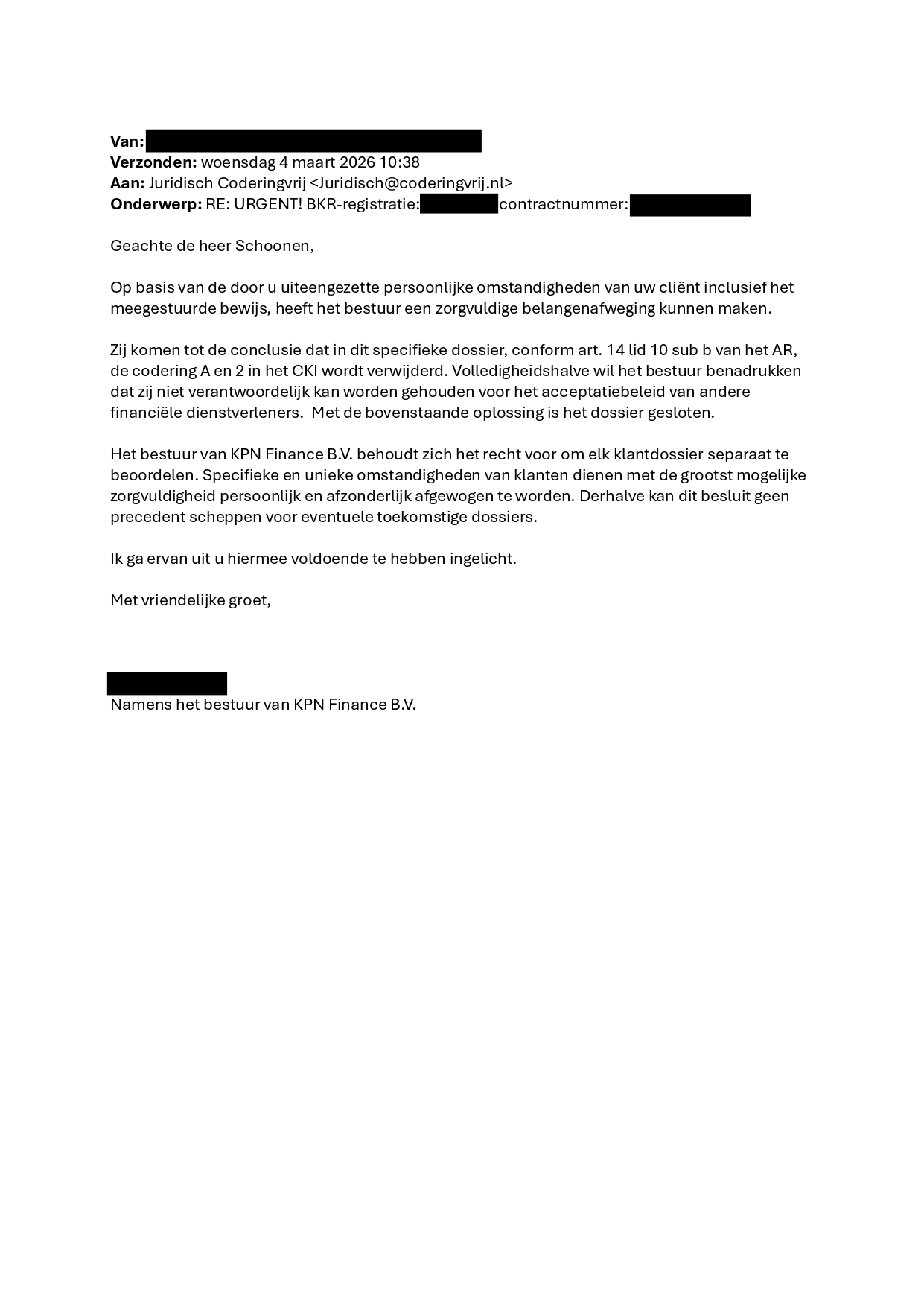 Pas bij het aanvragen van een hypotheek werden zij opgeschrikt door een negatieve BKR-registratie op naam van cliënt. Een registratie van KPN Finance B.V. met een