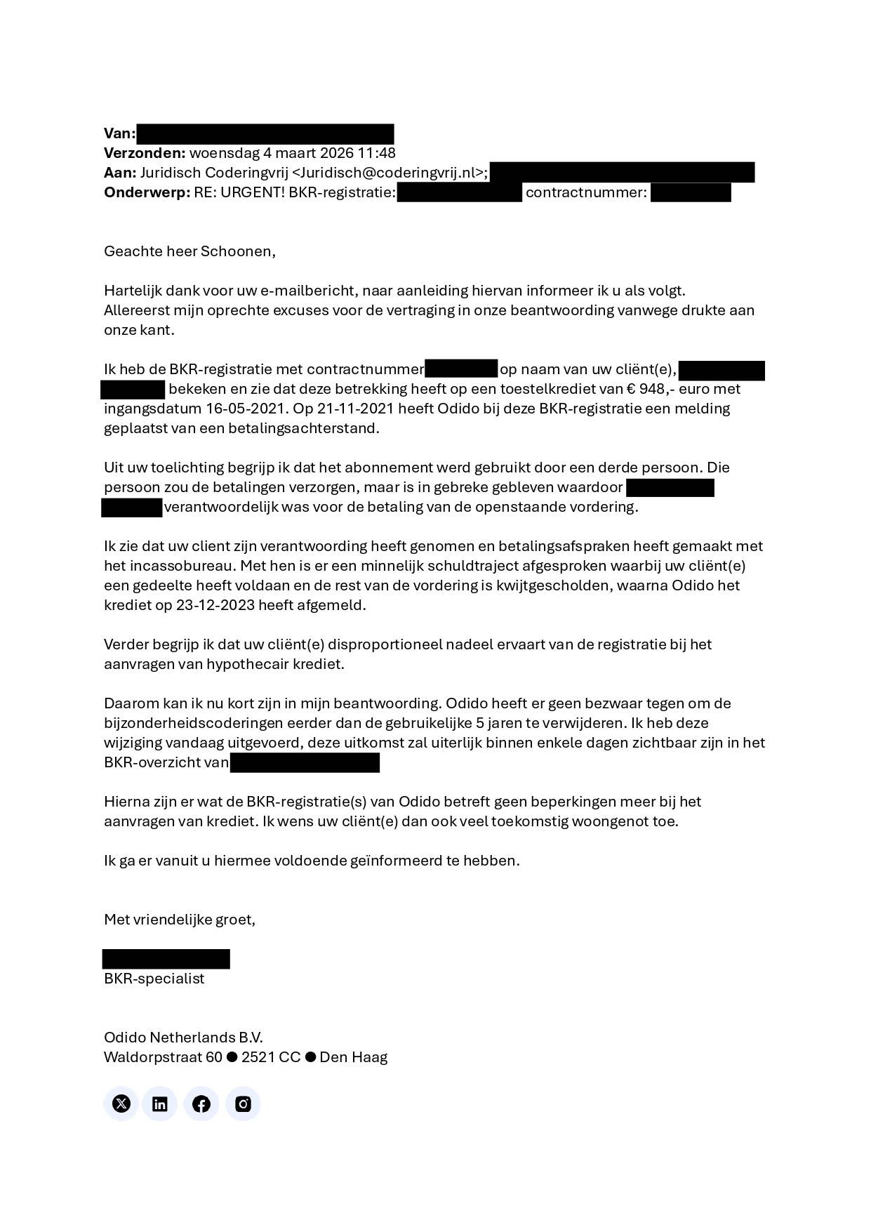 Adviesgesprek Op het moment dat cliënt contact opnam met de juridisch adviseurs van CoderingVrij, had hij last van één negatieve BKR-registratie. Een registratie geplaatst door Odido met twee